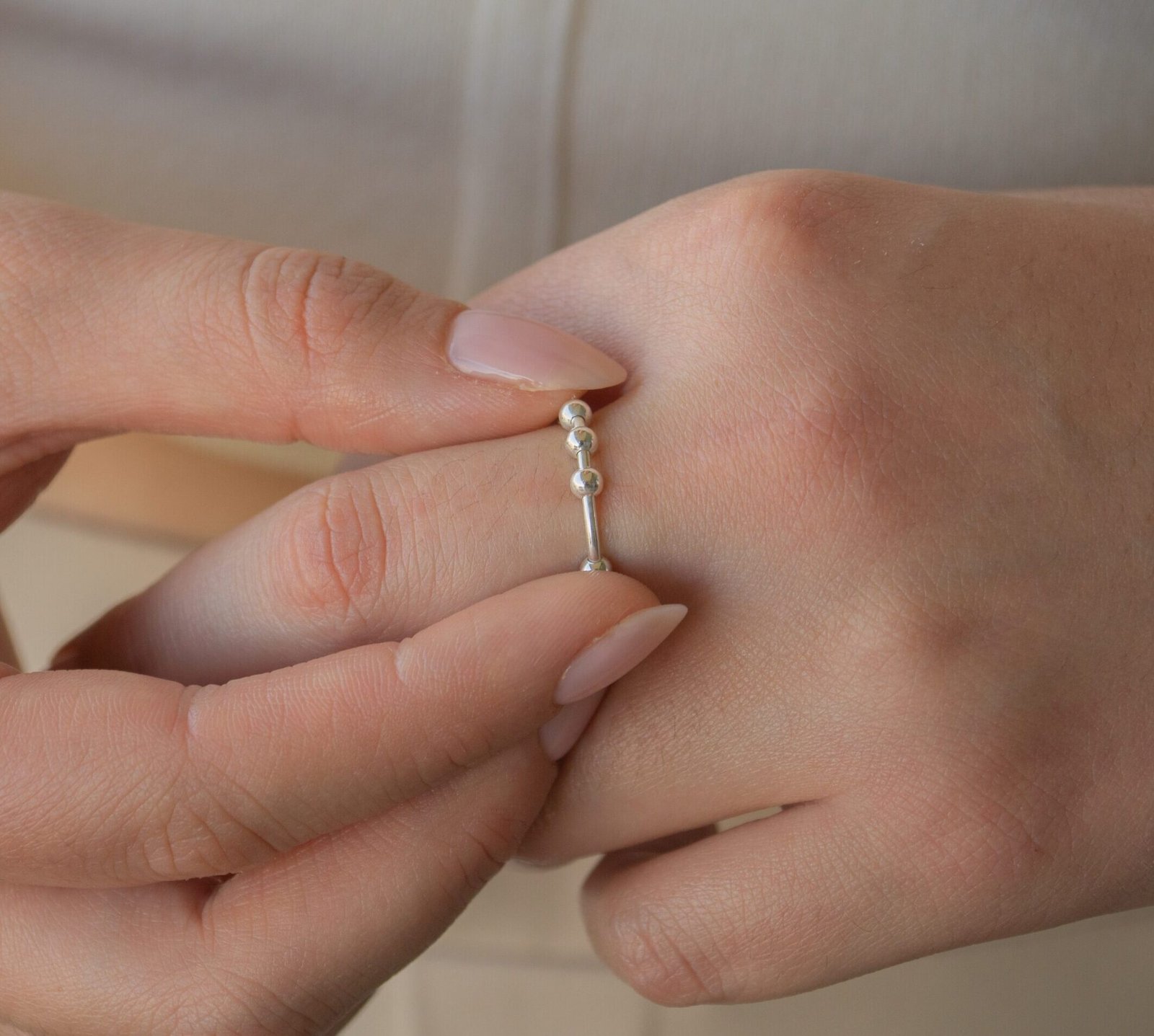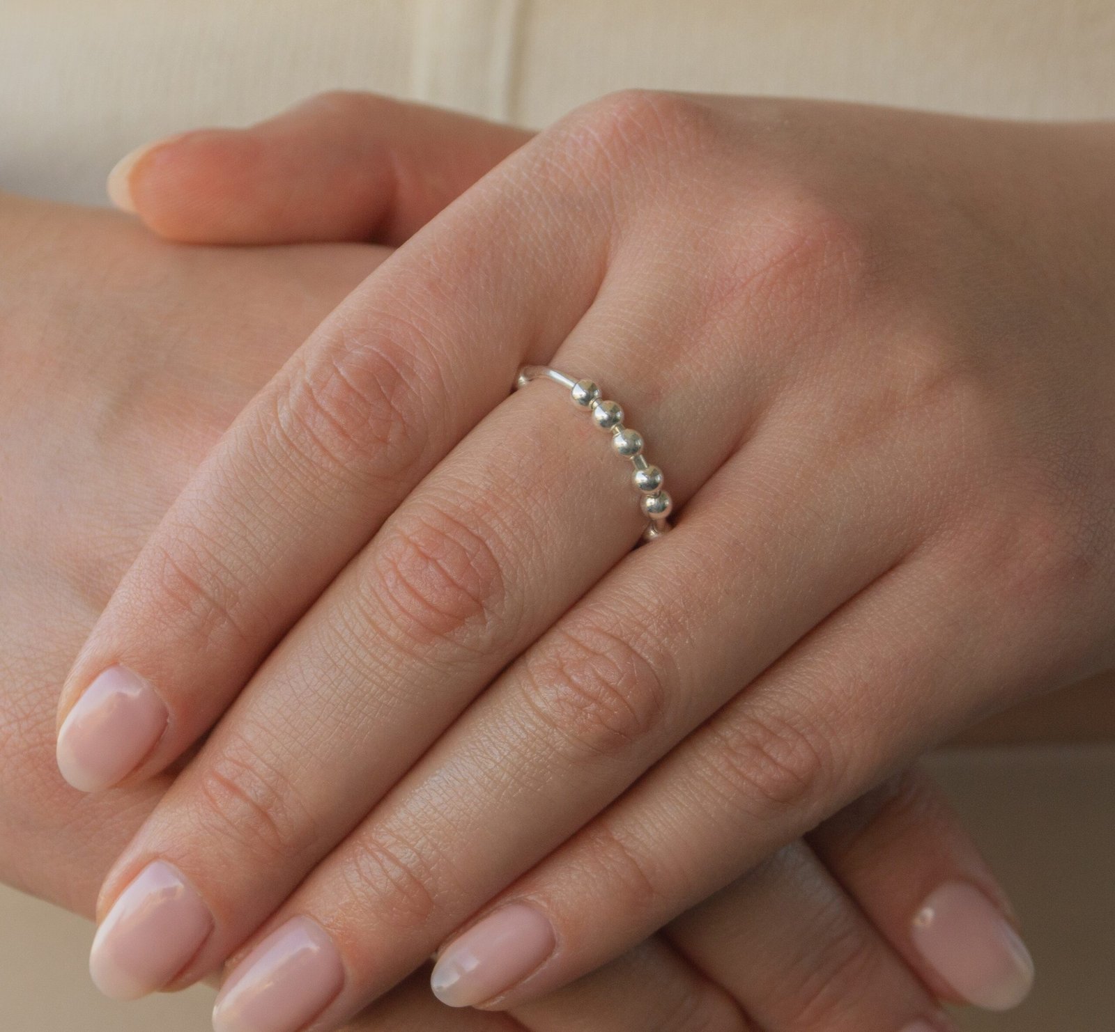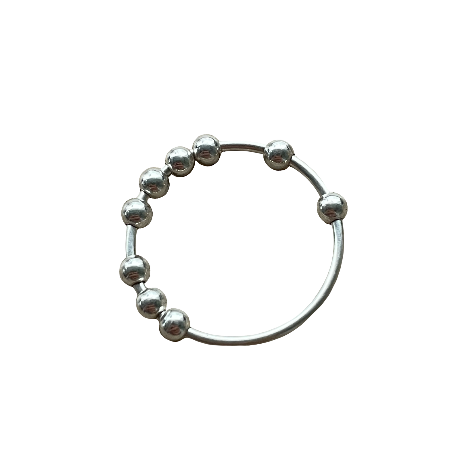 Anillo con esferas movibles por toda la argolla, este tipo de anillos se recomienda para desviar la atención a mover las esferas en momentos de estrés, ansiedad o nervios.