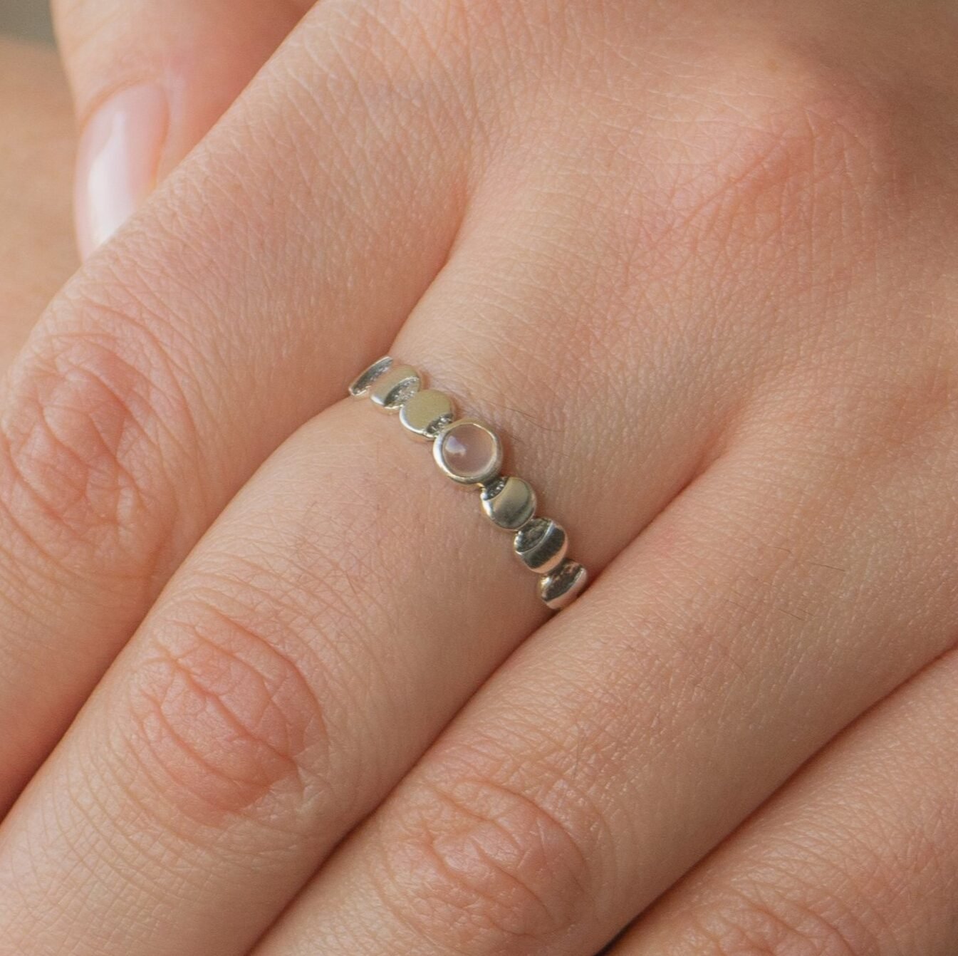 Descubre la magia celestial con nuestro anillo adornado con las fases lunares y una piedra natural de cuarzo rosa. Este diseño único, uno de nuestros más vendidos, combina misticismo y elegancia, convirtiéndolo en una pieza imprescindible para cualquier amante de la joyería distintiva.