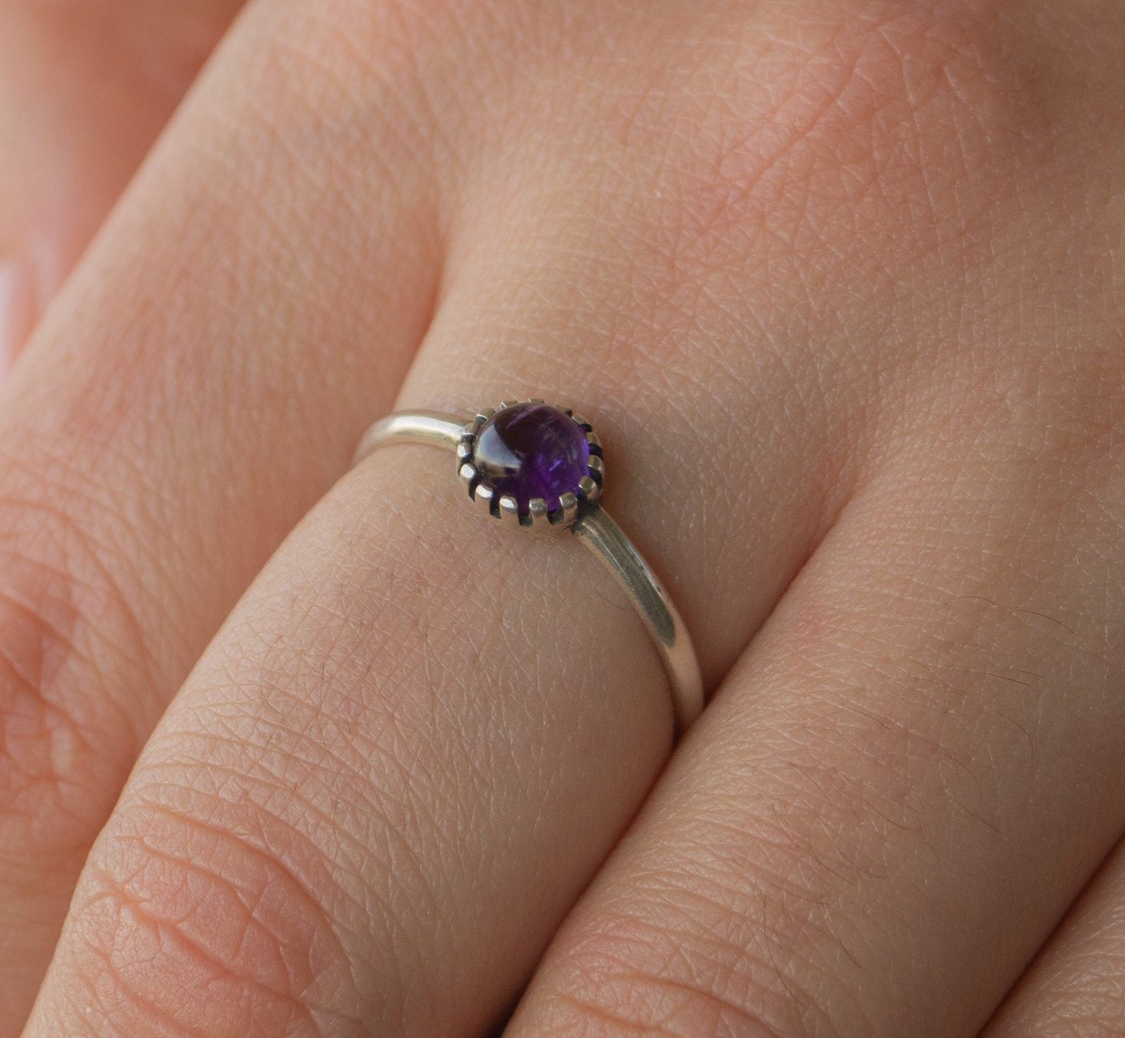 Anillo con piedra natural redonda de amatista. Conocida por sus propiedades espirituales, la amatista simboliza la claridad mental y la paz interior, convirtiendo esta pieza en un accesorio no solo elegante sino también lleno de significado y energía positiva.