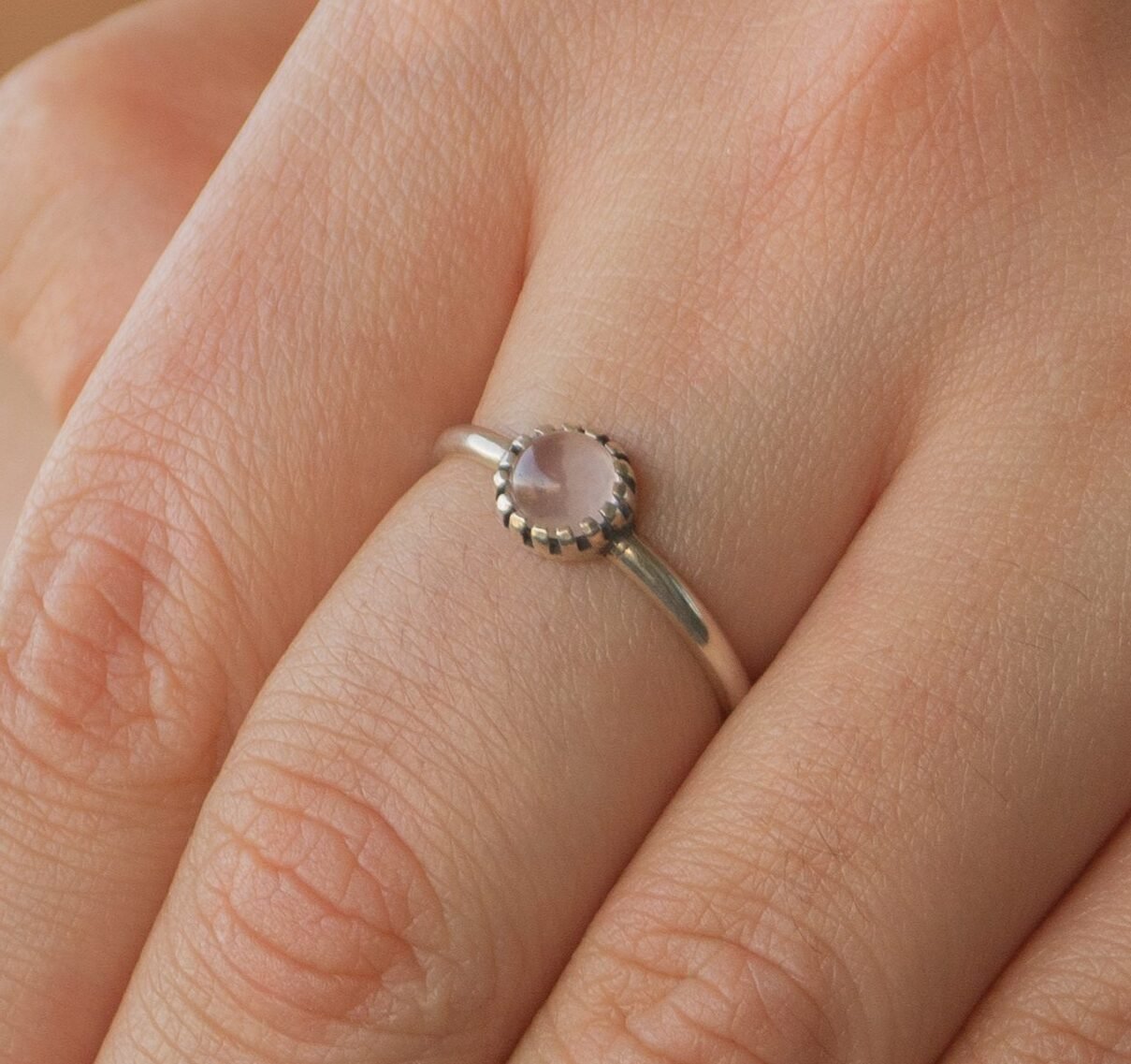 Anillo con una piedra natural redonda de cuarzo rosa. Conocido por sus propiedades espirituales, el cuarzo rosa simboliza el amor incondicional y la paz interior, convirtiendo esta pieza en un accesorio no solo elegante sino también lleno de significado y energía positiva.